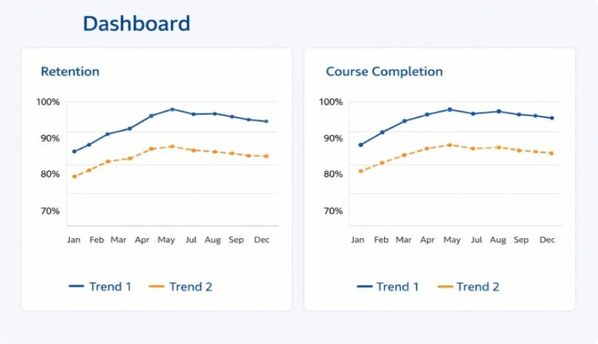 - Course success: completion rates, average final grades, and instructor feedback timeliness